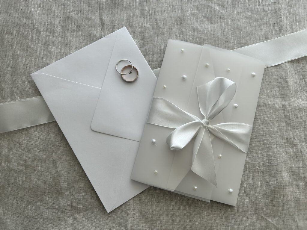 Sanft schimmerndes Perlmutt-Papier, edler Satin und Perlen – elegant und zeitlos.